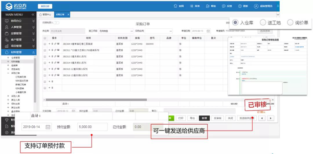 亮點(diǎn)4:采購訂單自定義流程審批,支持訂單預(yù)付款,一鍵發(fā)給供應(yīng)商(可自定義增加小單費(fèi)),同時(shí)滿足送工地和入倉庫以及供應(yīng)商詢價(jià)功能