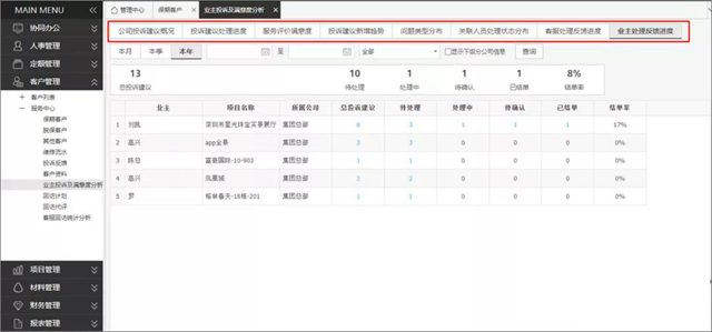 亮點4:售中、售后功能(保期、脫保客戶統計、維修流水記錄、客戶回訪跟蹤)服務中心集團總部的業主投訴反饋匯總、客服處理反饋、智能提醒回訪