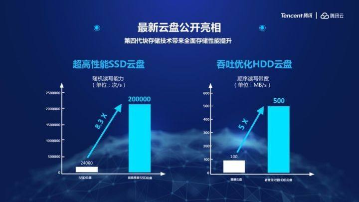 第四,在云盤產品上,騰訊云基于第四代塊存儲技術,帶來了云盤產品性能的大服務提升。其中,超高性能SSD云盤,IOPS相比較現在的SSD云盤,IOPS從2.4w 提升到20w,性能提升8.3 倍;而吞吐優化HDD云盤,相比較現在的普通云盤,其最大吞吐從100MB/s提升到500MB/s,提升5倍。